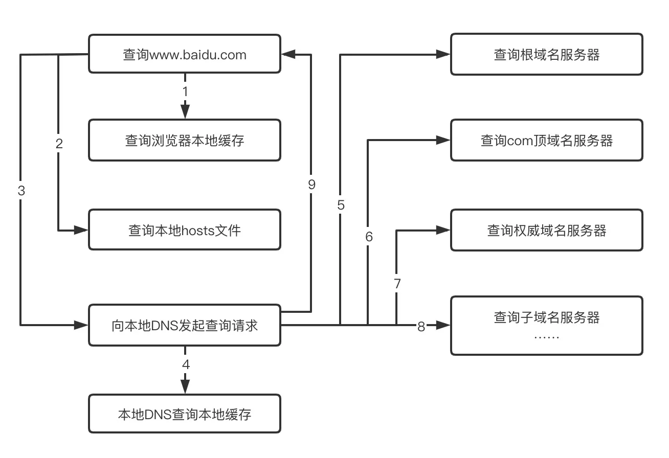 - 请求本地DNS服务器进行域名查询(至此的查询为递归查询)