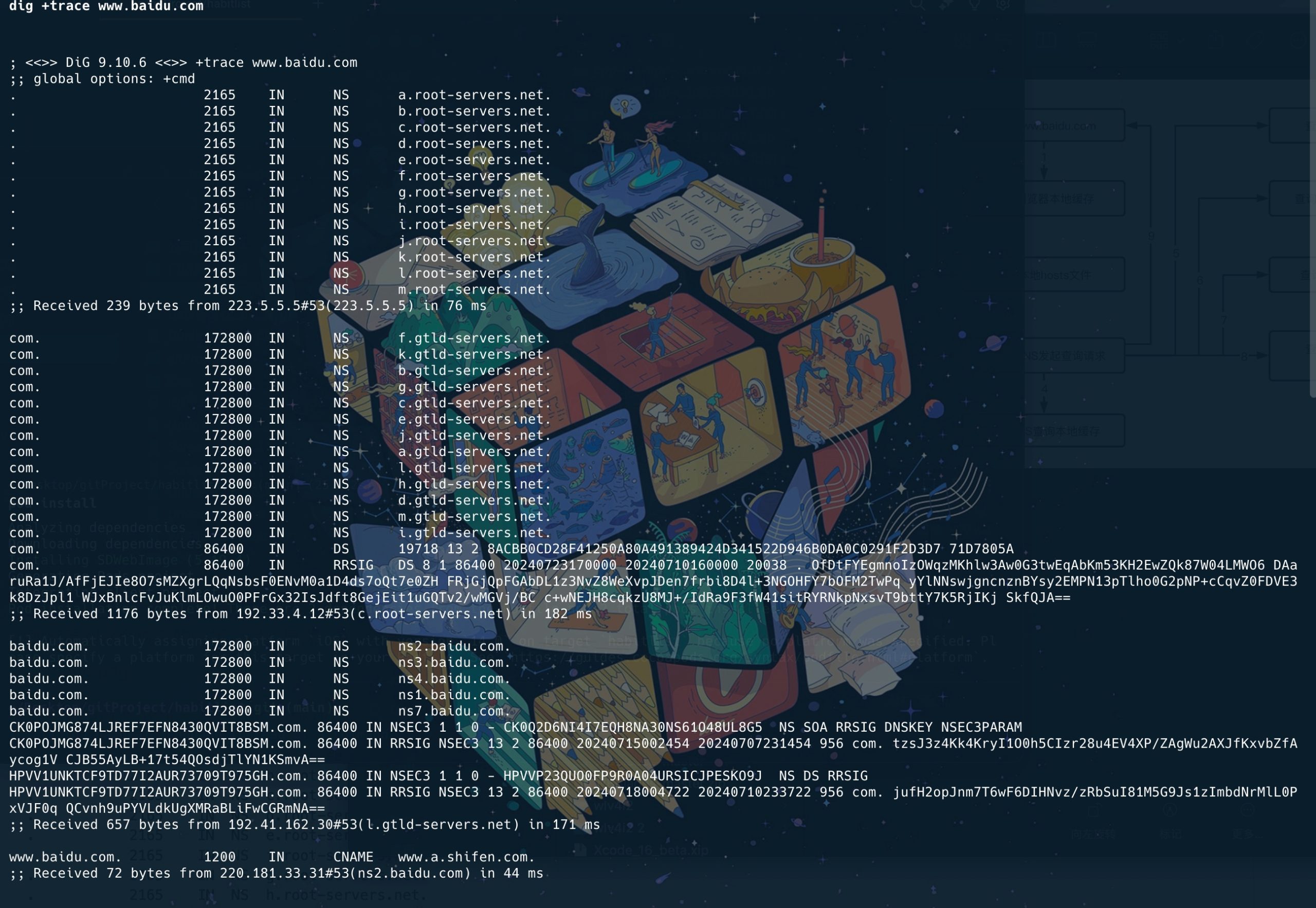 以www.baidu.com这个域名为例,使用dig工具查看其DNS解析流程。