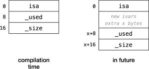 这是 __NSArrayM 类里的 _used ivar 的偏移量。为什么要那么麻烦去做额外的拉取,而不是简单地将变量 8 放到汇编程序中?原因就是脆弱基类 (fragile base class) 问题。 Objective-C 通过让它自身在运行时可以选择去重写在 0x1d102c 的值(和所有该问题的其它 ivar 偏移量)来处理这个问题。如果 NSObject、NSArray 或 NSMutableArray 增加新的 ivar,旧的二进制文件仍然可以工作。